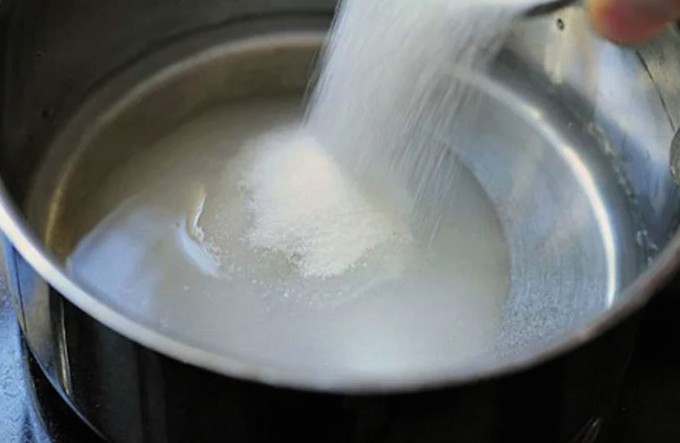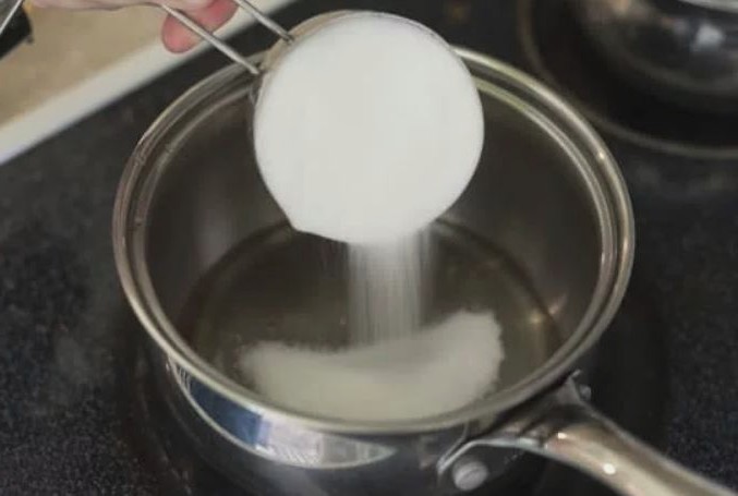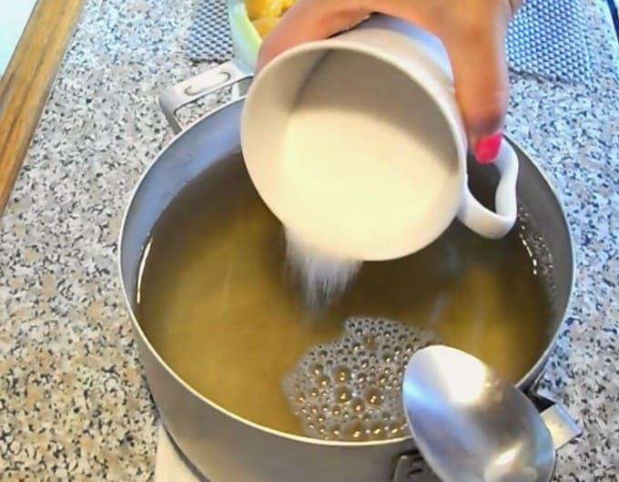 - Giet vervolgens het water in een geschikte pan. We verdunnen het water met suiker, steken in brand. Zodra de siroop kookt, zet je de timer voor 2-3 minuten aan. Voeg op het einde een snufje citroenzuur toe aan de siroop.