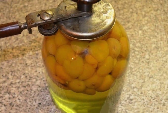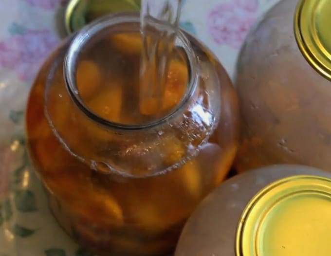- Vul de abrikozenpot met de bereide siroop. Daarna moet de compote onmiddellijk worden opgerold met een gekookt deksel.