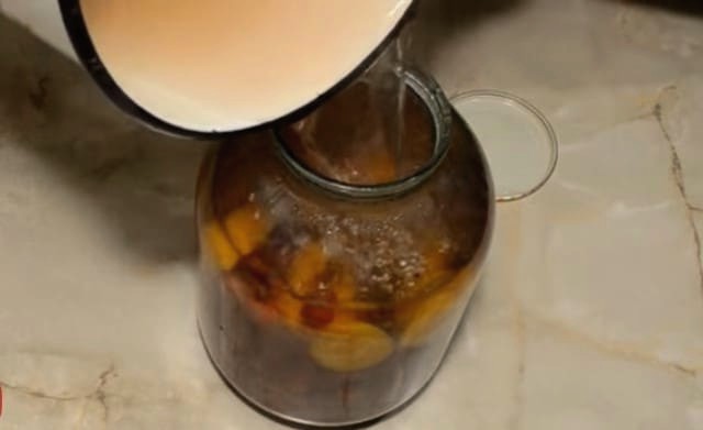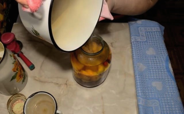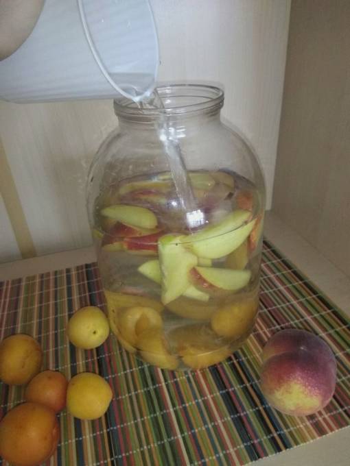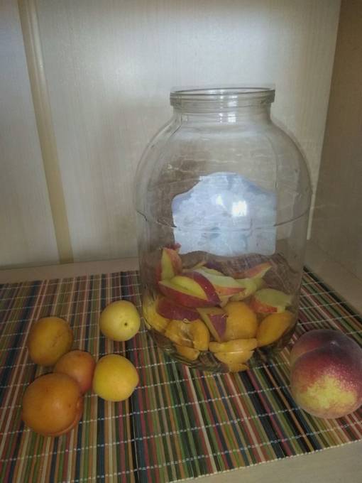 - Doe abrikozen en perziken in een gesteriliseerde pot van drie liter.