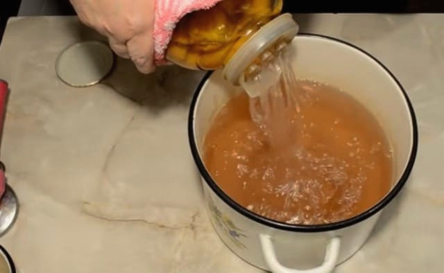 - Giet na een tijdje de vloeistof uit de pot in de pan. We zetten het op matig vuur, voegen na het koken de benodigde hoeveelheid suiker toe. We wachten op de volgende kook en koken de siroop dan nog 5 minuten.