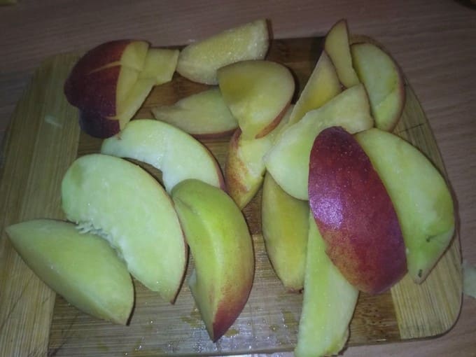 - Perziken moeten ook worden gewassen, in twee worden gesneden en de pitten moeten worden verwijderd. Snijd de perzikhelften in kleine plakjes.