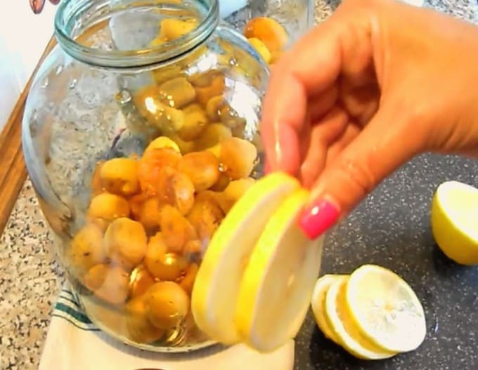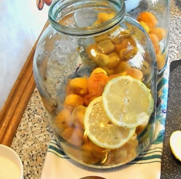 - Doe de schijfjes citroen in een pot met abrikozen.