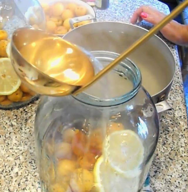 - Giet de kokende siroop over de abrikozen.