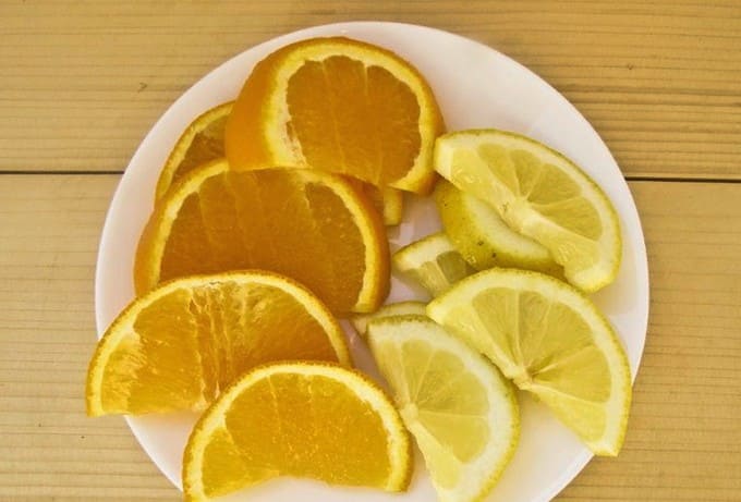 - Spoel de sinaasappel en citroen grondig af. Snijd de citrus in cirkels en vervolgens doormidden.