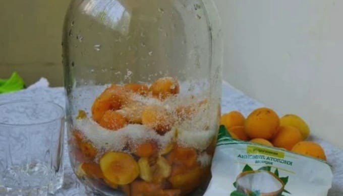 - We verspreiden voorbereide abrikozen en kersen in een pot van drie liter, voegen er suiker en een snufje citroenzuur aan toe. We vertrekken in deze vorm gedurende 30 minuten. Gedurende deze tijd zullen de vruchten sap afscheiden.