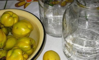 Week de kweepeer in koud water en spoel hem goed af. We steriliseren een pot van drie liter met een deksel op elke handige manier.