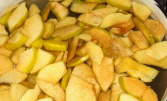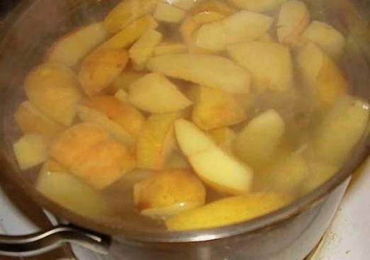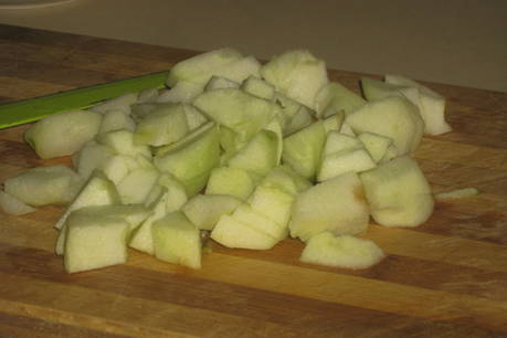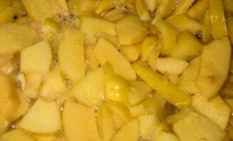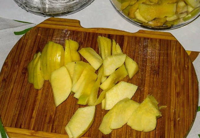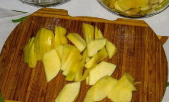 - Daarna snijden we de vruchten in middelgrote stukken. We verwijderen voorzichtig de kern.