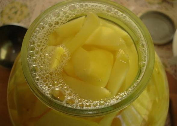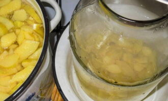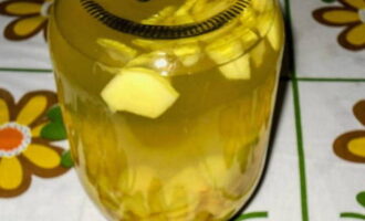 - We sturen het gesneden product naar schone en droge glazen potten. Giet kokend water over de inhoud gedurende 10 minuten. Overkapping is optioneel.