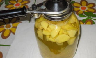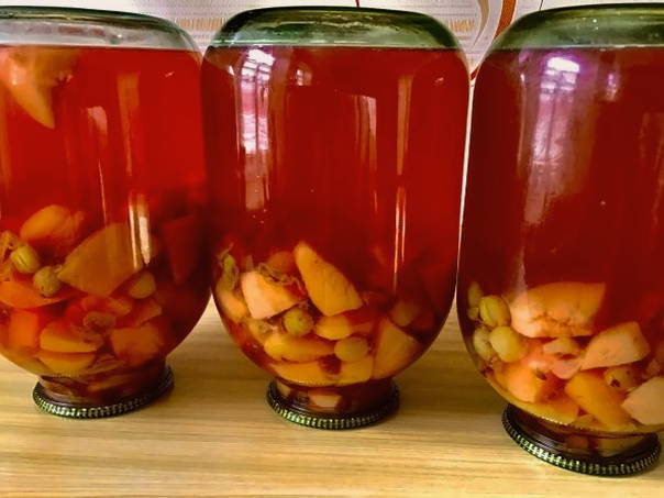 Na gereedheid wordt de compote voorzichtig in een voorbereide pot van drie liter gegoten.