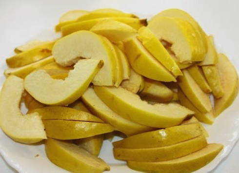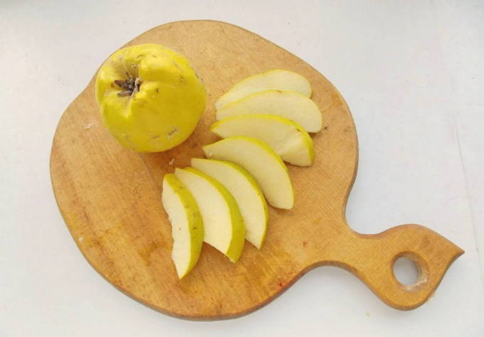 Snijd de gewassen kweepeer in dunne plakjes. We verwijderen de zaden voorzichtig.