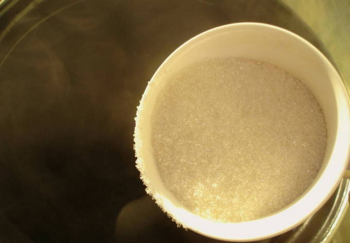 - Kook in een grote pan vijf glazen water en voeg hier suiker toe. Kook tot het droge ingrediënt is opgelost. Roer af en toe.