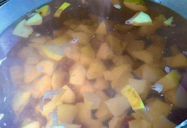 Daarna koken we de massa tot de kweepeer zacht is.