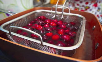- Was de bessen, gooi ze weg in een vergiet om de vloeistof te verglazen. Met frambozen moet heel voorzichtig worden omgegaan om ze niet te pletten.