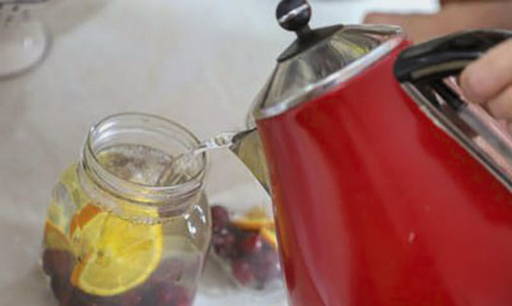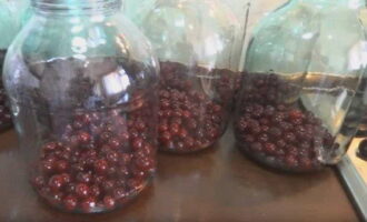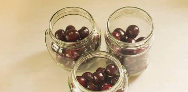 - Doe de kersen in een droge, gesteriliseerde pot. Giet kokend water in de pot tot de bovenkant en laat 15 minuten staan.