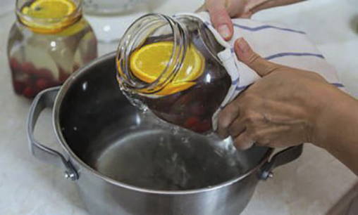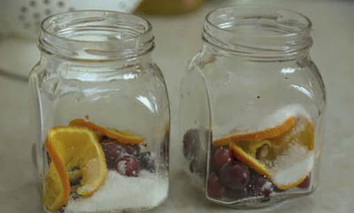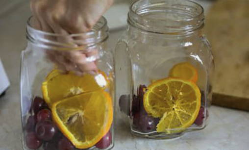 - Schik de kersen en sinaasappels in droge gesteriliseerde potten.