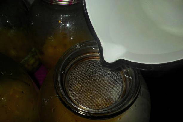 - Giet vervolgens het water uit de blikken terug in de pan, voeg suiker toe. Breng de siroop aan de kook, kook tot de suiker volledig is opgelost.