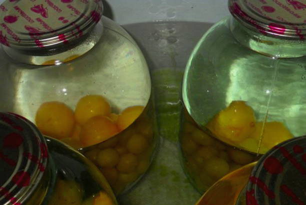 Potten voor compote moeten worden gewassen met een reinigingsmiddel en gesteriliseerd, deksels voor naad moeten worden gekookt.