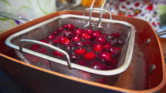 - Sorteer de kersen, was ze en gooi ze weg in een vergiet.
