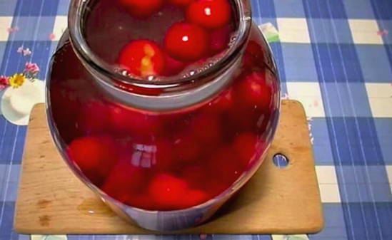 - Doe de kersen in een droge, gesteriliseerde pot. Giet kokend water in de pot tot de bovenkant en laat 15 minuten staan.