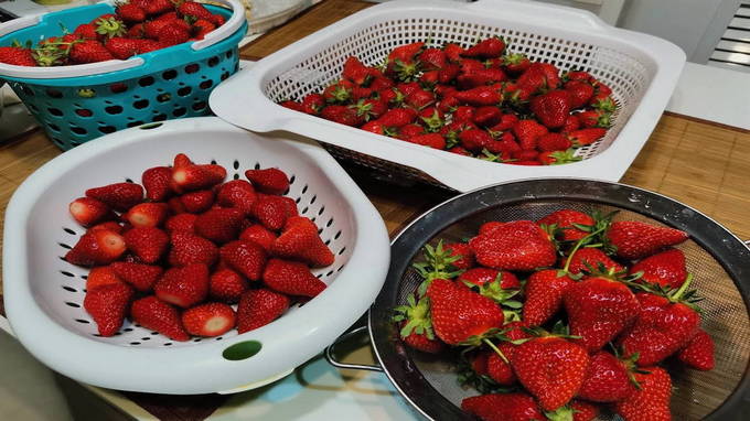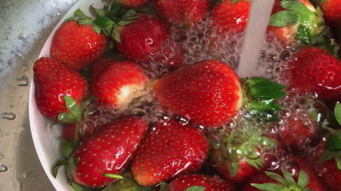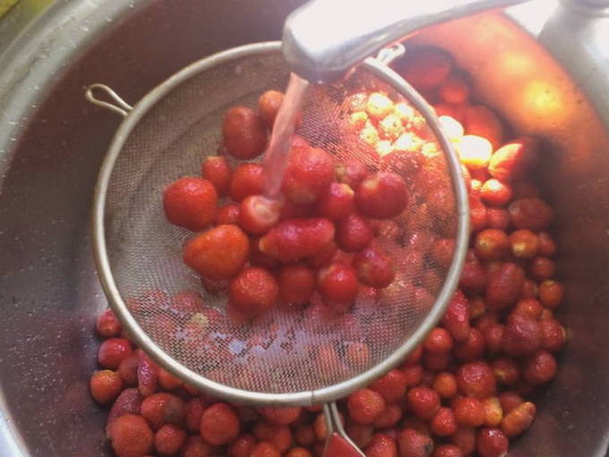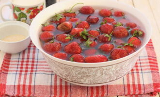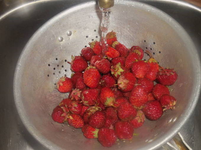 We sorteren de bessen: gooi de onrijpe en bedorven exemplaren weg. We spoelen meerdere keren af met koud water. Tot slot laten we de aardbeien in het water staan zodat de zand- en vuilkorrels naar de bodem zinken.