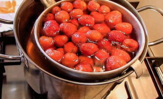 - Na sterilisatie zetten we de potten op een schoon tafelblad en beginnen we met het bereiden van de bessensiroop. Giet water in een grote pan en verwarm op hoog vuur. Doe de aardbeien in potten en giet de siroop in een pan. We wachten tot het kookt en koken nog 4 minuten.