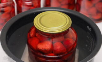 - Giet de siroop in potten met aardbeien en dek af met deksels. Als het water in een grote pan tot 50 graden is opgewarmd, zet je daar potten compote. Het water moet de "schouder" bereiken. We verwarmen het water tot 85 graden en verminderen de warmte. We houden de banken 15-20 minuten.