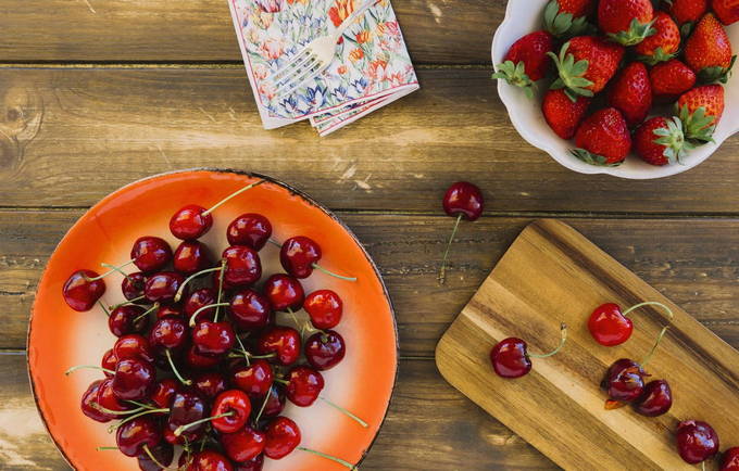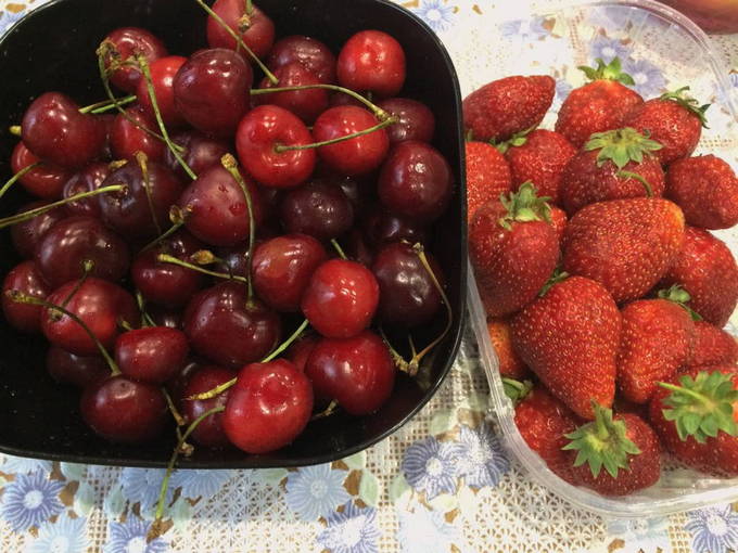 - Leg de gewassen bessen op een papieren handdoek zodat overtollig vocht wordt opgenomen. Schenk de aardbeien en kersen in aparte kommen.
