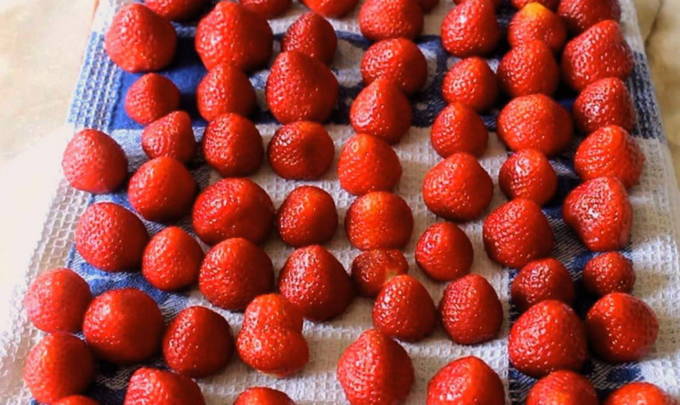 - We leggen papieren handdoeken op de keukentafel en leggen er aardbeien op zodat ze volledig drogen. We wassen de pot en het deksel voor de compote met frisdrank, onderzoeken op scheuren en chips (de pot moet intact zijn). Laat de pot en het deksel drogen.