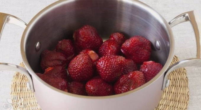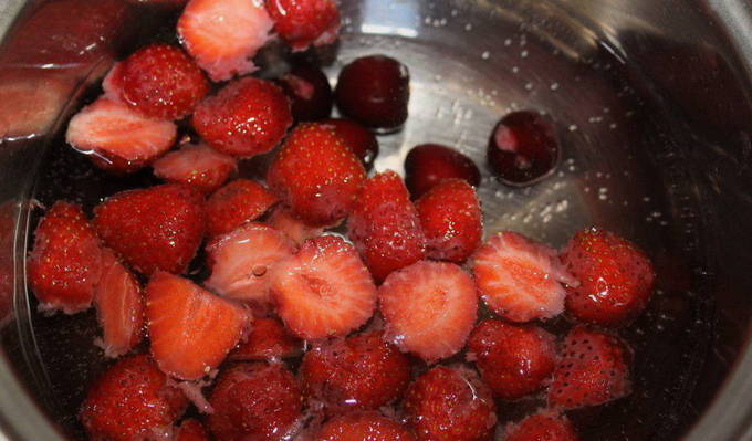 - We nemen een grote pan. Giet er kersen in, gevolgd door aardbeien.