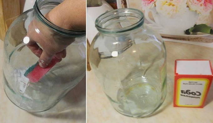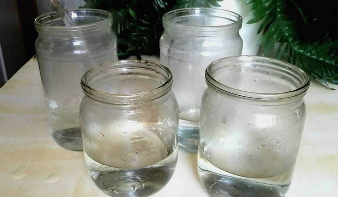 - Maak eerst de potten schoon met een spons en soda en was ze. We zetten een klein bakje water op het fornuis en brengen aan de kook. Giet gekookt water in potten tot de helft. We wassen ook de deksels en gieten 5 minuten kokend water in een aparte kom.