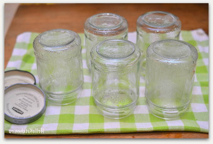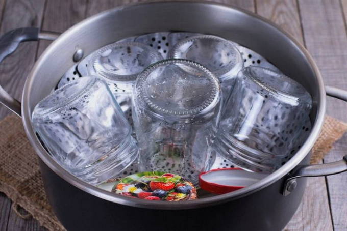 - Allereerst steriliseren we de potten en deksels met een stoombad (ze moeten eerst worden afgespoeld).
