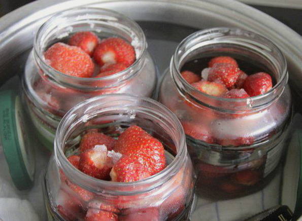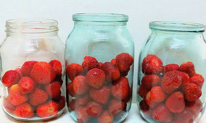 - We leggen de bessen in de potten. Indien gewenst kunnen ze in stukjes worden gesneden. Zorg ervoor dat de potten voor 1/3 gevuld zijn met aardbeien.