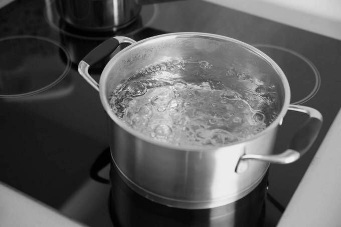- Giet water in een pan en plaats deze op het fornuis. We zetten aan en wachten tot het water kookt.