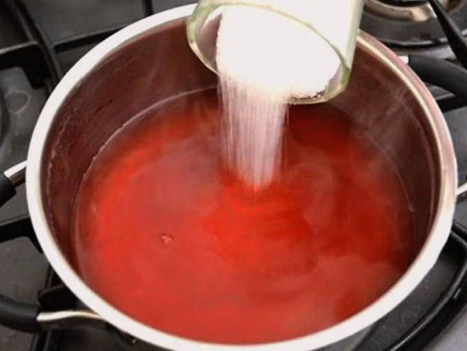 - Giet het water af in een pan zonder bessen. Breng het aardbeienvocht aan de kook en voeg suiker toe. Breng opnieuw aan de kook.