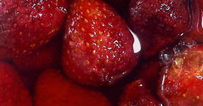 - Neem een diepe kom en giet de bessen erin. Vul ze met suikersiroop. Dek goed af met huishoudfolie en laat 3-4 uur staan. Gedurende deze tijd hebben de aardbeien de tijd om het sap op te starten.