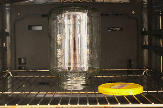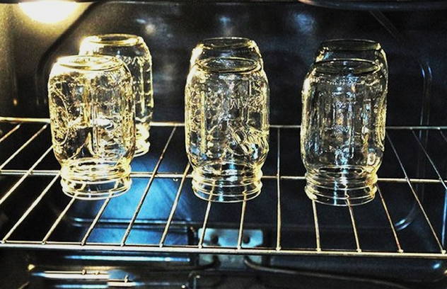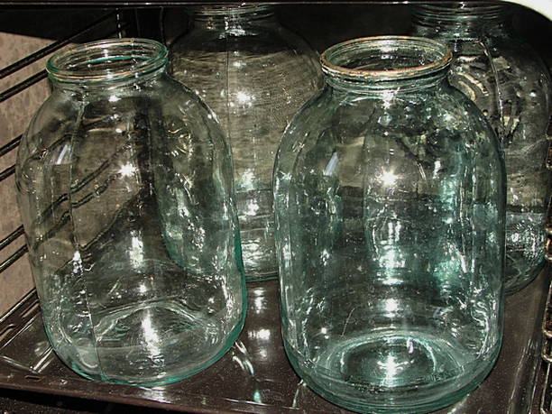 - We zetten twee potten in de oven, plaatsen de deksels ernaast. Ze moeten worden gesteriliseerd. We zetten de oven aan.