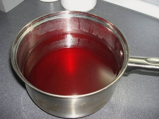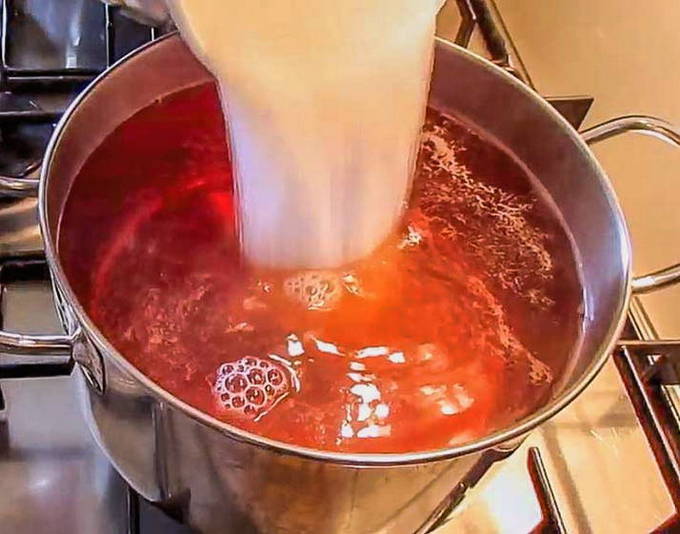 - Giet de vloeistof terug in de pot. De bessen mogen er niet af vallen, doe dit dus beter door een fijne zeef. We zetten het fornuis aan en brengen de bessensiroop op laag vuur aan de kook. Voeg suiker toe. Kook gedurende 10-15 minuten, totdat het oplost.