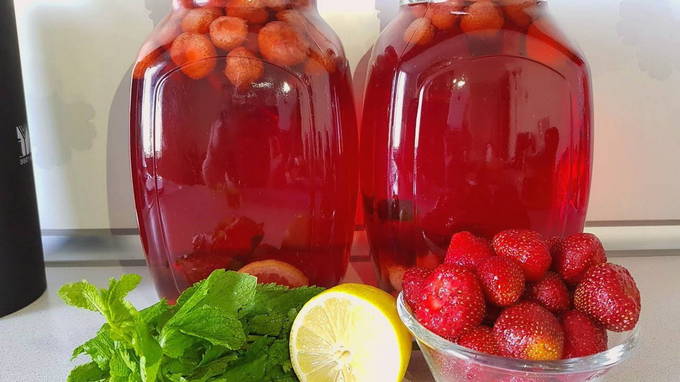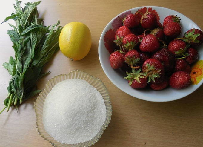 - Giet het afgekoelde water uit de potten in de gootsteen. Leg op de bodem van de blikken aardbeien, twee schijfjes citroen en een paar takjes munt. Kook water in een pan en giet het in potten. Bedek ze met deksels en laat 60 minuten staan.