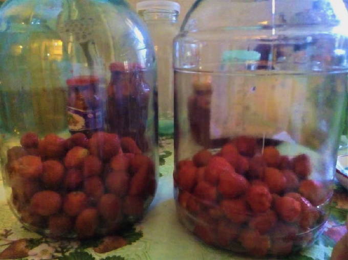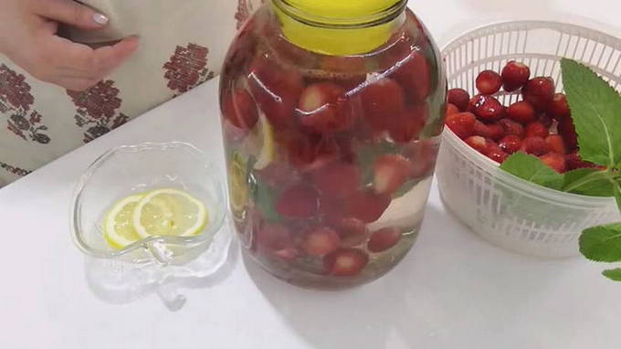 - We verspreiden kersen op de bodem van de pot en vervolgens aardbeien. Vul ze met zoete vloeistof zodat er geen lege ruimte is. We bedekken de pot met een deksel.