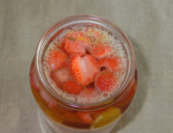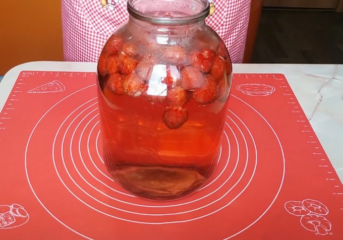 - We sturen aardbeien naar een pot. Meestal is het 1/3 vol, maar u kunt meer plaatsen. Vul de bessen met kokend water.We sluiten de pot met een deksel en laten 10-15 minuten staan om de drank te laten trekken.
