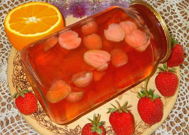 - Giet na 15 minuten het aardbei-sinaasappelvocht in de pan. We zetten het fornuis aan en gieten suiker in de vloeistof. Aan de kook brengen. Dek de pot af met een deksel en rol hem op. Draai de kom met compote ondersteboven, wikkel hem in en laat hem twee dagen afkoelen. Na twee dagen zetten we het op een koele plaats voor opslag.