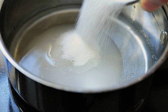 - Terwijl de pot en het deksel in de oven staan, hebben we tijd om de siroop te bereiden. We zetten een pan water op de brander. Zet het fornuis aan en breng het water op middelhoog vuur aan de kook. Voeg suiker toe en kook de siroop nog 10 minuten. Een paar minuten voordat u de pan met het mengsel van het fornuis verwijdert, giet u citroenzuur.