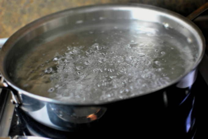 We zetten een pan water op het fornuis en brengen aan de kook.