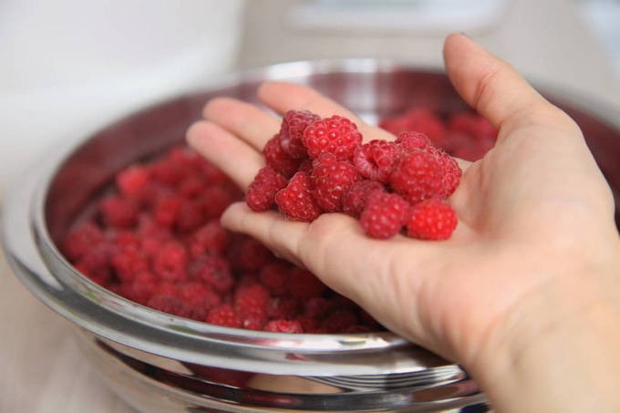 - We sorteren aardbeien en frambozen. Frambozen bevatten vaak wormen, dus er moet speciale aandacht aan worden besteed. We verwijderen de aardbeien van de stengels. We reviseren de bessen zodat ze heel en sterk zijn. We spoelen onder stromend warm water. Droog de bessen. We gebruiken hiervoor een papieren handdoek.