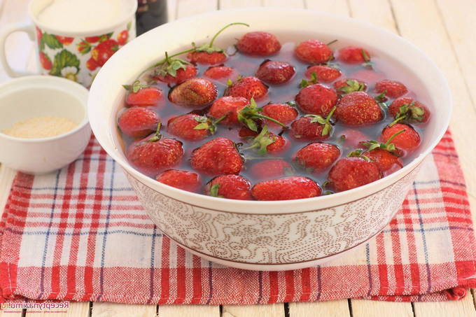 - Neem een diepe kom en giet de bessen erin. Vul ze met suikersiroop. Dek goed af met huishoudfolie en laat 3-4 uur staan. Gedurende deze tijd hebben de aardbeien de tijd om het sap op te starten.