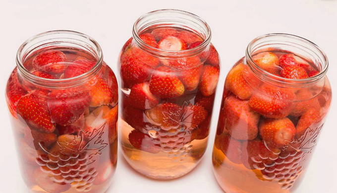 Om aardbeiencompote voor de winter te bereiden, moet je dichtere bessen toevoegen en kleine vruchten heel laten en grote in tweeën of in vier delen snijden. Het is beter om kokend water over de aardbeien te gieten: ze zullen niet inkoken en intact blijven.