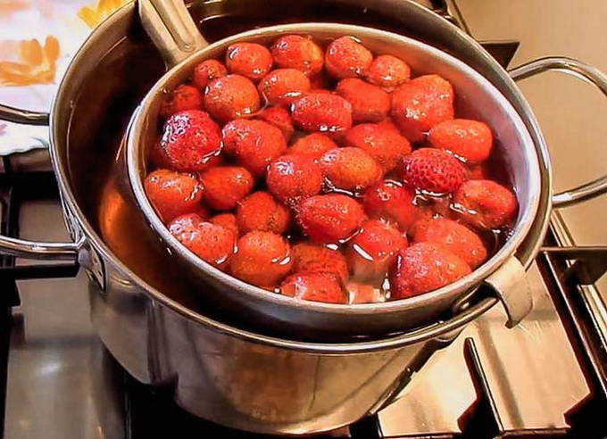 - Na sterilisatie zetten we de potten op een schoon tafelblad en beginnen we met het bereiden van de bessensiroop. Giet water in een grote pan en verwarm op hoog vuur. Doe de aardbeien in potten en giet de siroop in een pan. We wachten tot het kookt en koken nog 4 minuten.