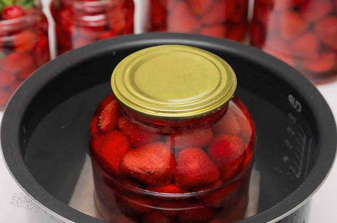 - Giet de siroop in potten met aardbeien en dek af met deksels. Als het water in een grote pan tot 50 graden is opgewarmd, zet je daar potten compote. Het water moet de "schouder" bereiken. We verwarmen het water tot 85 graden en verminderen de warmte. We houden de banken 15-20 minuten.