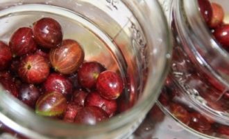 - Doe de kruisbessen in schone, gesteriliseerde potten, die je al uit het afval had moeten sorteren, gespoeld en gedroogd in een vergiet.