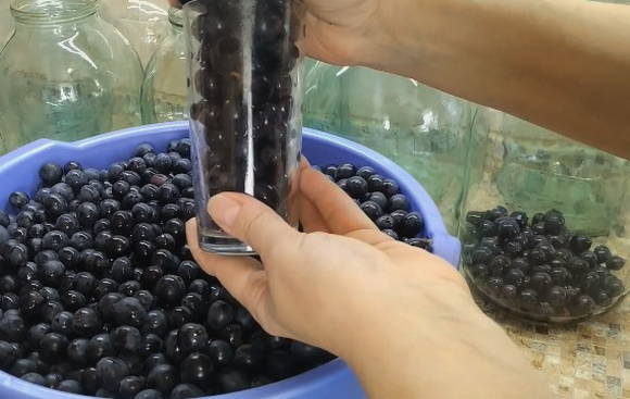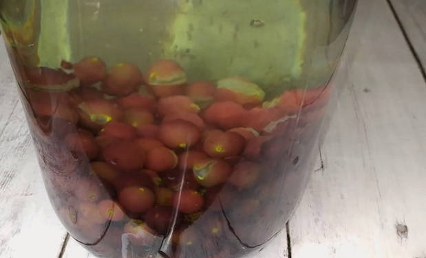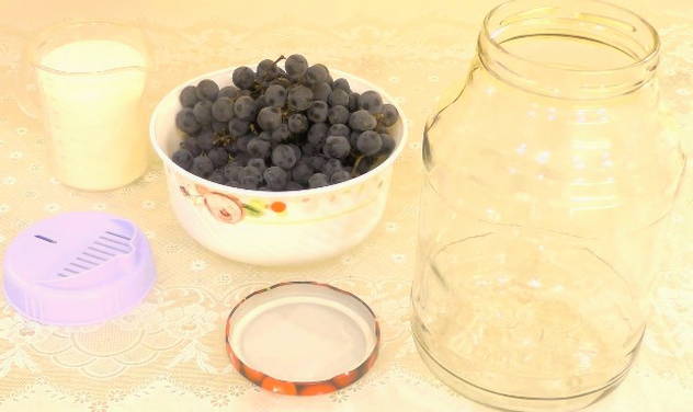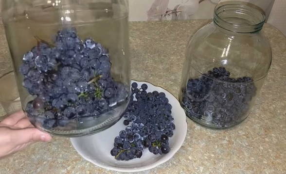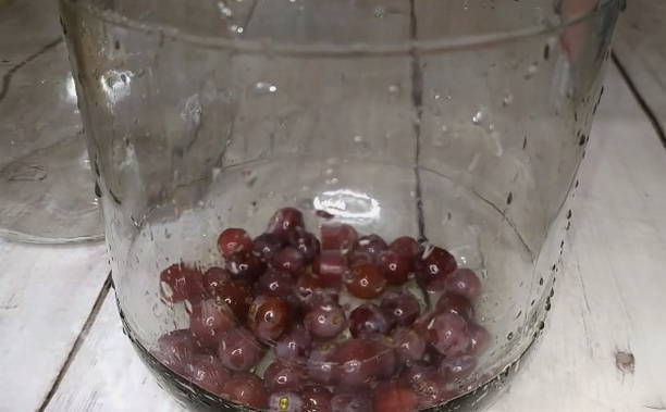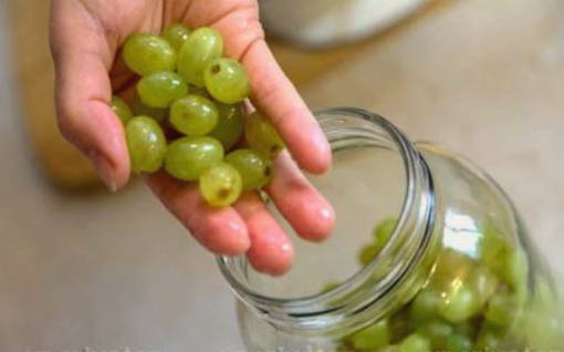 - We wassen de potten grondig met soda en zorgen ervoor dat ze drogen. Pas dan beginnen we de druiven op de bodem te verspreiden, waarbij ze ongeveer 2/3 van het totale volume van de container in beslag nemen.